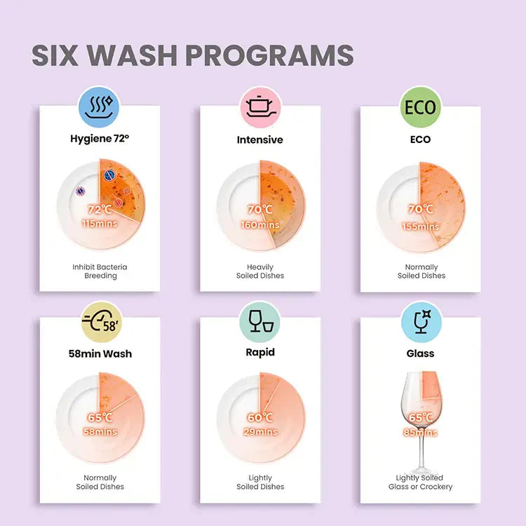 The exceptional cleaning quality of the EZClean™ Mini Dishwasher Compact makes it the optimal choice. With six specially designed wash programs, each program is optimized to ensure impeccable results. Enjoy convenience and efficiency without compromise.