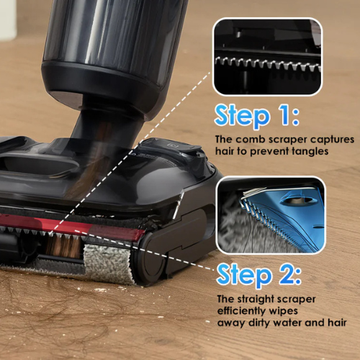 Say goodbye to messy hair clogs with the innovative DualBlock Anti-Tangle Design. Dual-layer scrapers work together to capture pet hair, dust, and debris, while a comb scraper prevents tangling and a straight scraper wipes away dirty water and residues. This technology makes it a top choice for pet owners and delivers more practical performance than standard upright vacuums, robot vacuums, or simple cordless stick models.