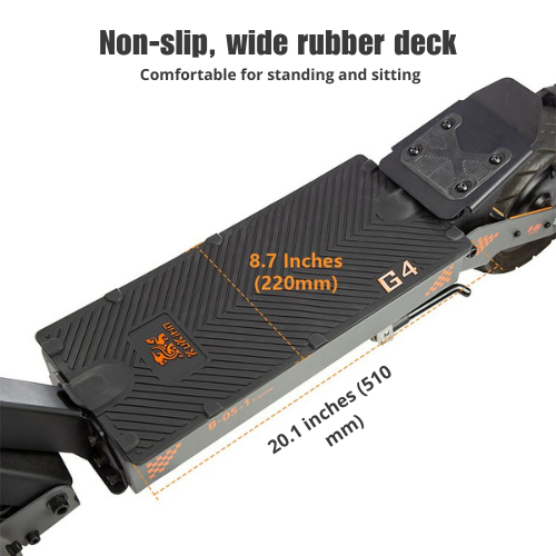 EvoRide™ is equipped with an advanced four-arm suspension system that absorbs vibrations on all types of terrain. The extra-wide 11-inch vacuum tires provide stability, grip, and a smooth riding experience — even on sand, gravel, or snow. Thanks to the large footboard (510 × 210 mm), you can enjoy extra comfort on longer rides.